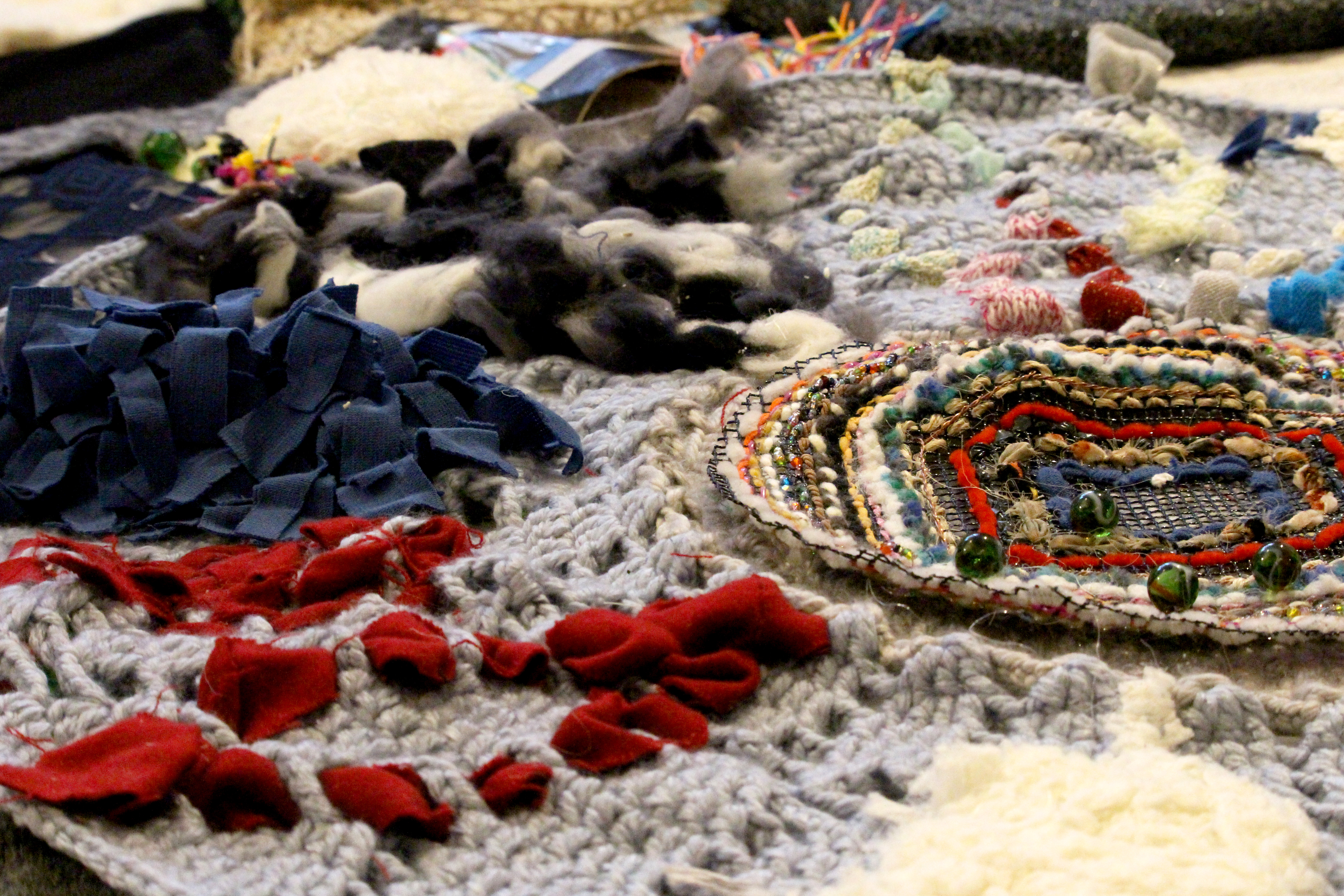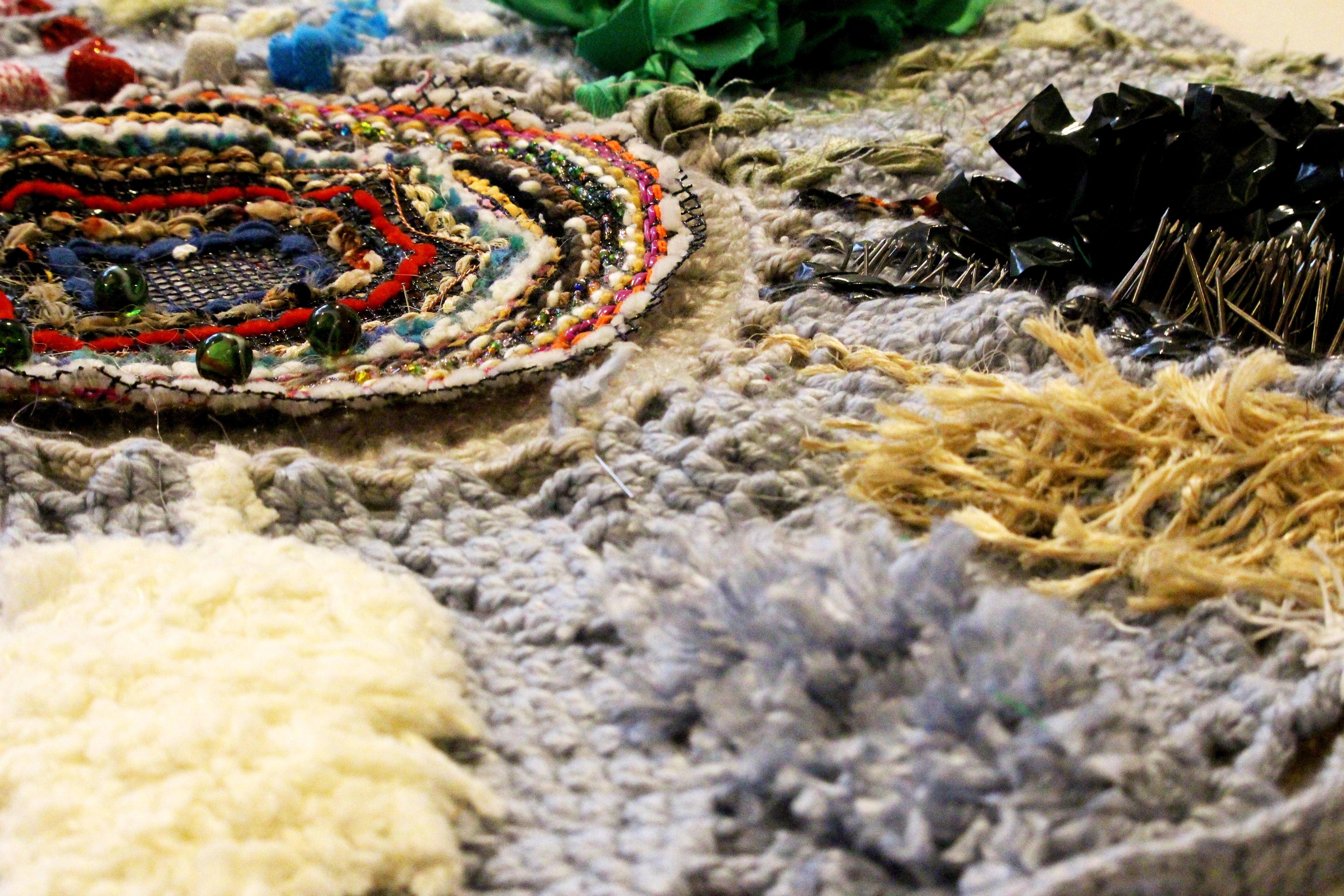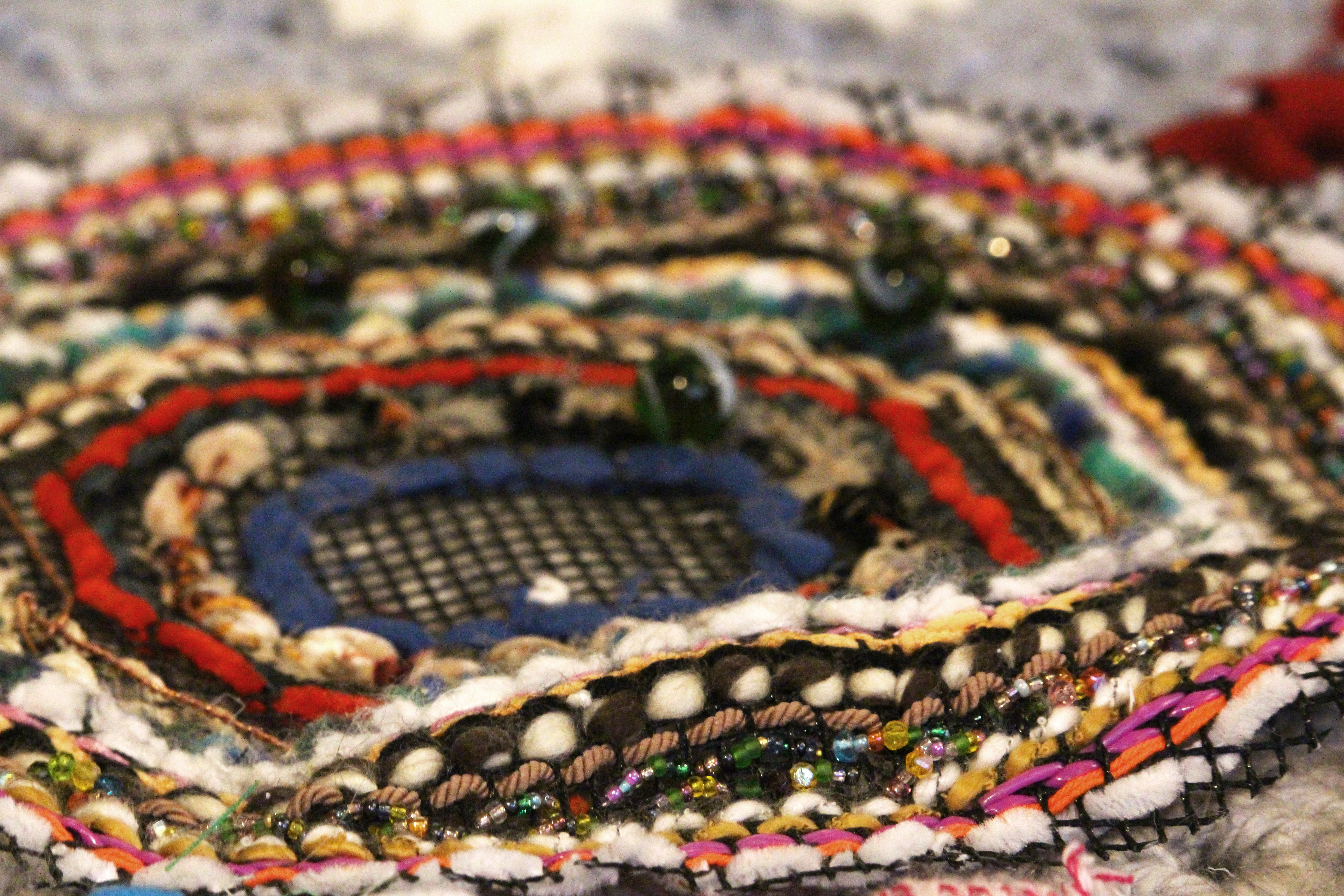 Pour ce faire, j’ai travaillé en collaboration avec des hyperesthésiques pour mieux comprendre moi-même ce qu’ils ressentaient. J’ai établi des témoignages, j’ai testé leurs sens, pour me permettre de voir comment accentuer ou provoquer les sens chez une personne non hyperesthésique. Des premières expérimentations sur les techniques textiles comme le crochet ou le tricot m’ont permis de voir que le surefficient adore la complexité et la diversité des méthodes utilisées. C’est donc une recherche sur la superposition et la surdose qui ont commencé.