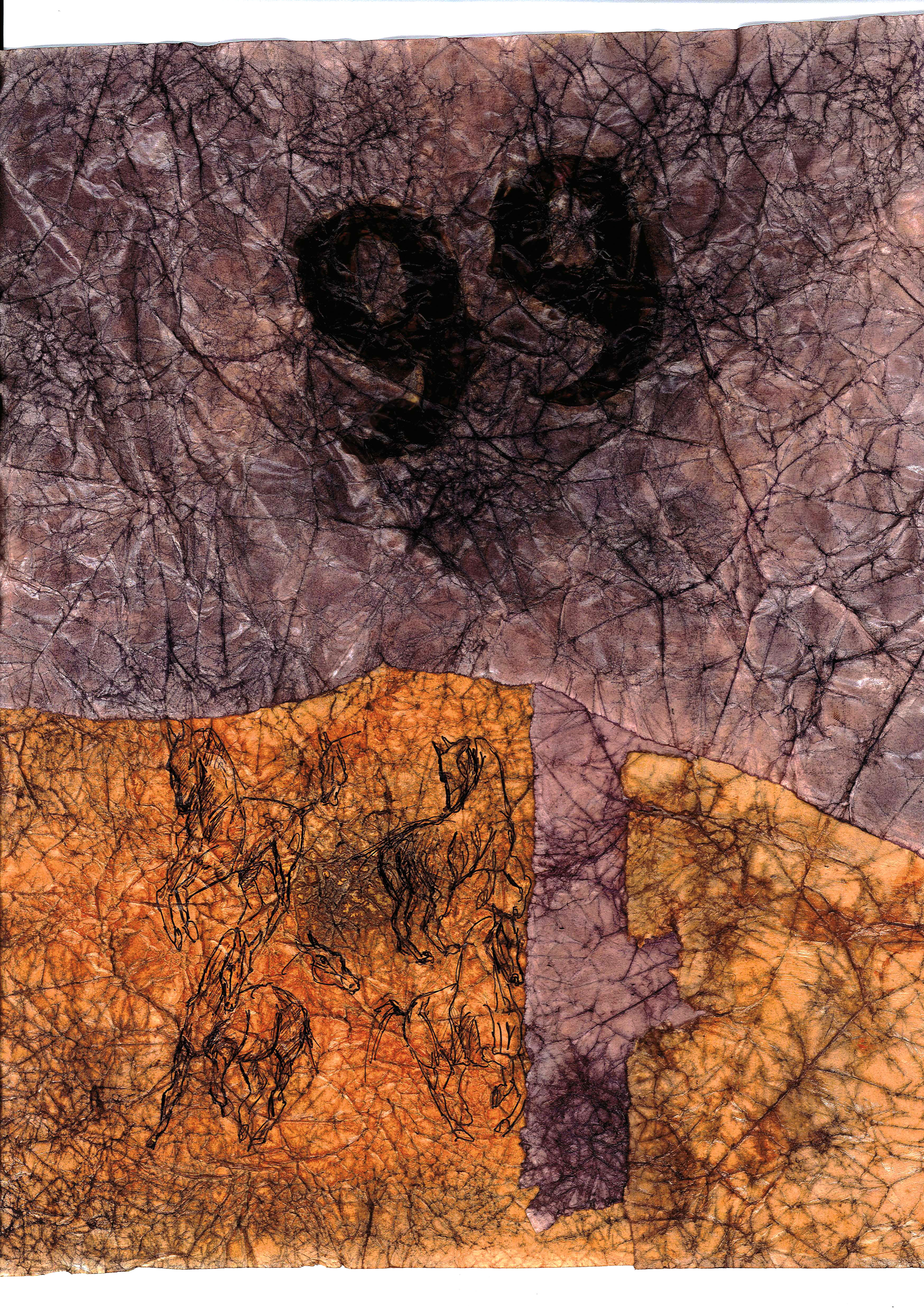// crumbled paper leather. dyed with inks and varnish. a patchwork with the color of tanned hide. and raw meat. this animal is dead. the leather is the skin of a corpse. the skin is branded with a 99. symbol of belonging. this animal was an object. Jane Birkin was called by a 99 during her schooling. dehumanization, humiliation. the cow 99 was killed. the horse is idolized, drawn by Hermès. the cow is an animal. the horse is an animal. why not the horse ? speciesism. the horse has beautiful colors. the horse has a beautiful skin. it will be a beautiful leather. inconsistent, unfair, report it. veganism. a message to spread, to share. to send message. send the sms : « why not the horse instead of the cow 99? ». the human is an animal. why not the human ?